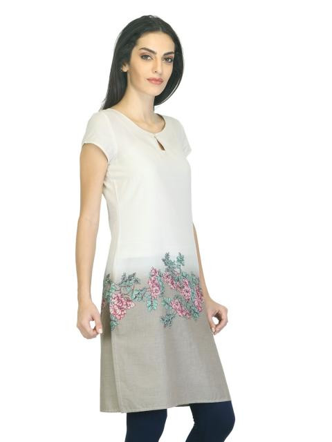 Cream kurta with a shaded effect in brown made of 100% cotton, has a round neck with a keyhole opening and a buttoned closure, short sleeves and slit side seams