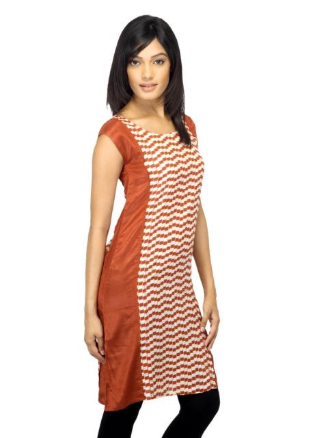 Rust printed kurta made of 100% viscose, has a round neck, short raglan sleeves, panel stitch at the sides and a vented hem