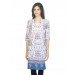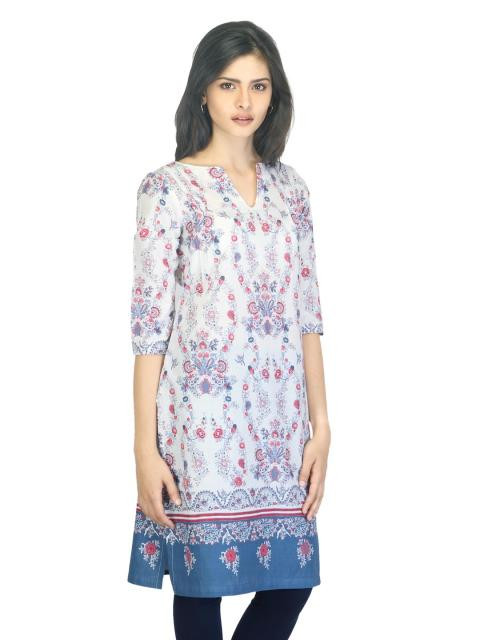 White and pink floral print kurta made of 100% cotton, has a round neck with a slit neckline, three quarter sleeves, pin-tucks on either side of the placket and slit side seams