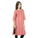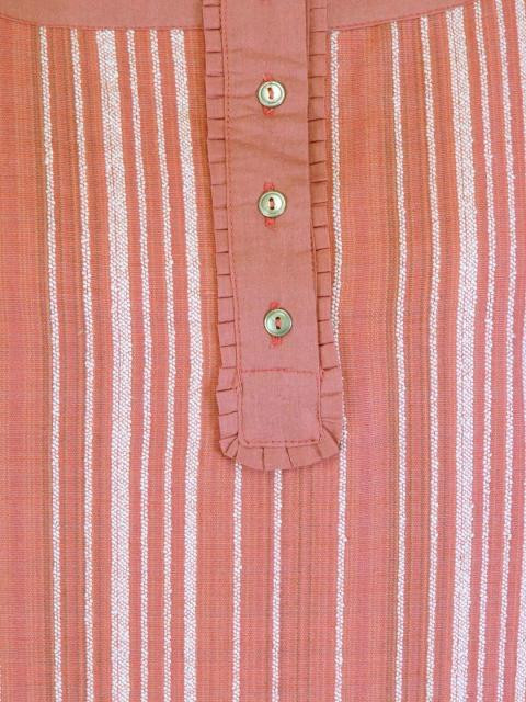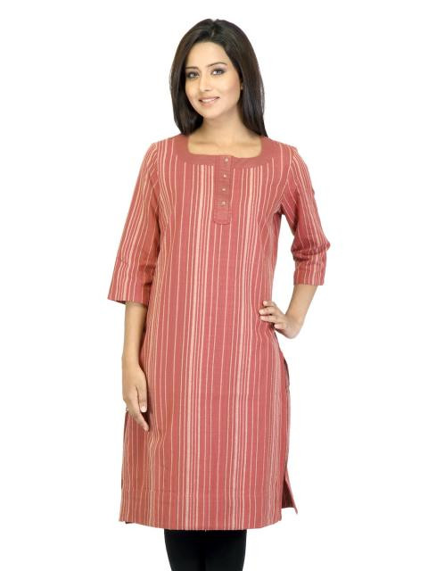 Red and brown striped kurta made of 100% cotton, has three-quarter sleeves, round neck with a buttoned chest placket, tight ruffles around the placket and split side seams